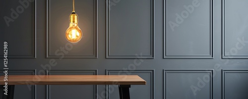 © Usama, Fototapeta premium Stylish golden hanging light bulb contrasts against gray walls, illuminating an oak table with black legs in a contemporary interior design setting.