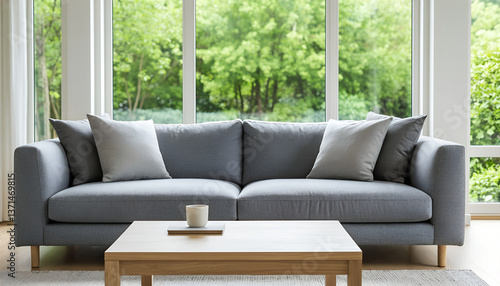© JoyfulImages, Fototapeta premium Stylish Gray Sofa and Wooden Table in Cozy Living Room