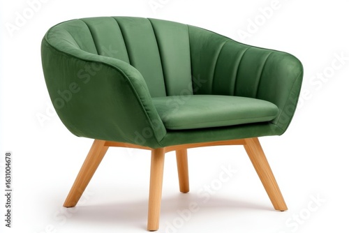 © songsi, Naklejka premium Stylish Green Upholstered Armchair with Natural Wooden Legs for Modern Interior Decor and Furniture Design