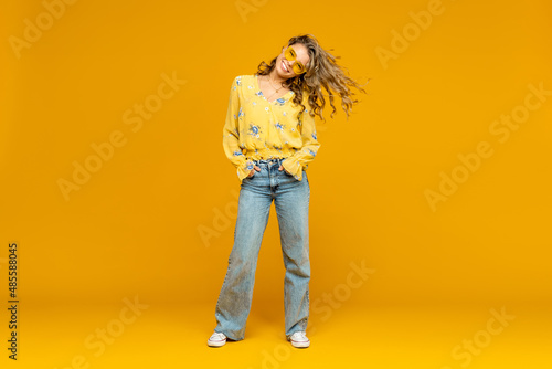 Fototapeta premium stylish happy smiling blond woman posing in jeans on yellow background
