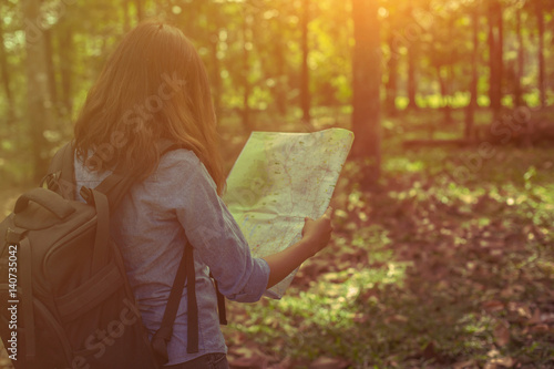© Chittakon, Obraz premium stylish hipster traveler exploring map at sunny forest and lake in the mountains