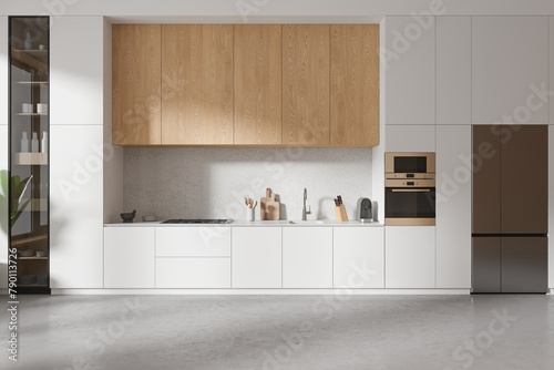 Fototapeta premium Stylish home kitchen interior with cooking cabinet and kitchenware, fridge