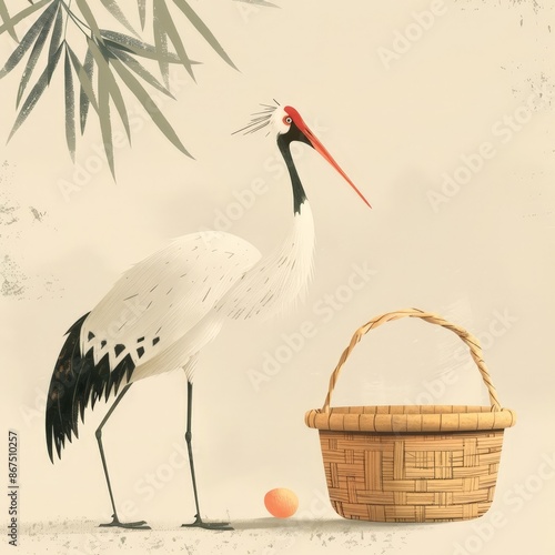 Fototapeta premium Stylish Illustration of a Crane Standing Next to a Woven Basket and an Orange