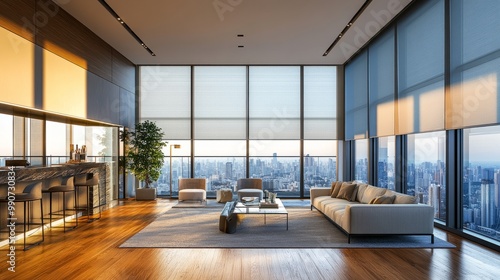 Fototapeta premium Stylish interior with floor-to-ceiling windows, motorized roller blinds,...