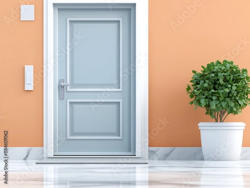 Fototapeta premium Stylish Light Grey Front Door 3D Render: Calm Minimalist Exterior Design. AI...