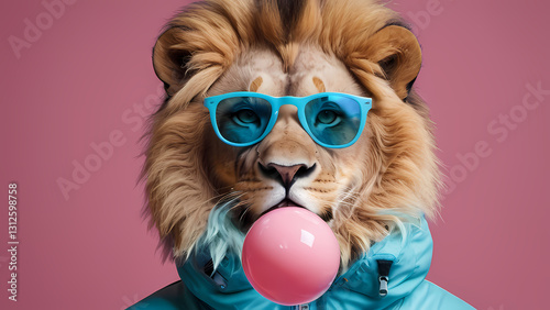 Fototapeta premium Stylish lion poses with pink bubblegum against a vibrant pink background in a...