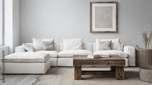© Tabi, Fototapeta premium Stylish living space with a white modular sofa, rustic coffee table, and a mockup frame with a 3D border.