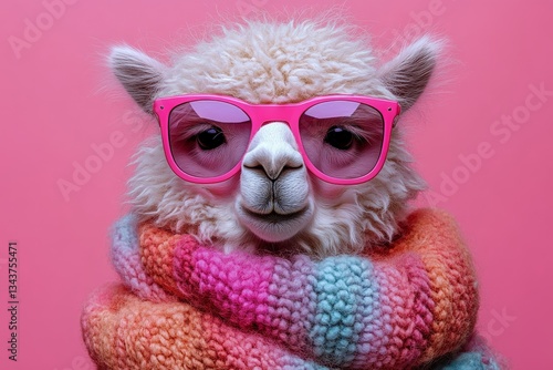 Fototapeta premium Stylish llama dressed in colorful scarf and pink glasses poses against a...