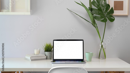 Obraz premium Stylish loft workspace with blank screen laptop computer..
