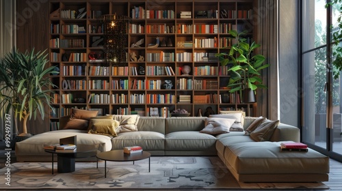 © Mas, Obraz premium Stylish lounge interior with comfortable sofa and bookshelf AI generated image