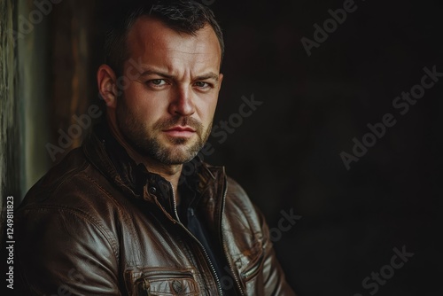 Fototapeta premium Stylish man in a leather jacket looking confidently at the camera.