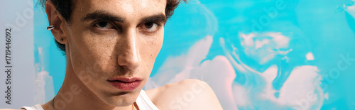 © Bliss, Obraz premium Stylish man in elegant attire poses with confidence against a vibrant backdrop