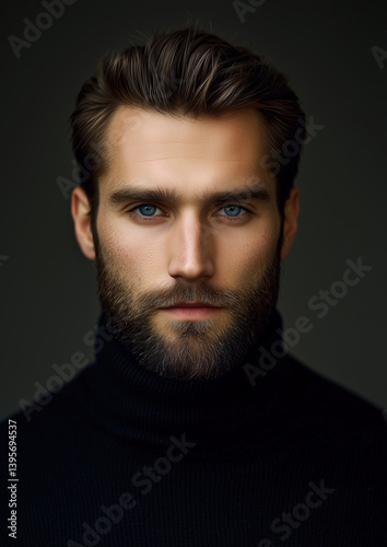 © vvalentine, Fototapeta premium Stylish man with brown hair, blue eyes, and a beard wearing a black turtleneck against a neutral gray background