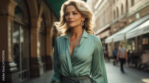 Fototapeta premium Stylish Mature Woman Strolling through Urban Street in Ellegant Green Blouse....