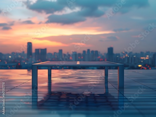 Naklejka premium Stylish Metal Table by Rooftop Pool with Urban Skyline View in Contemporary Setting