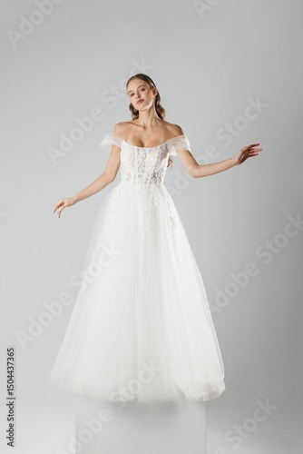 © Svetlana, Fototapeta premium Stylish model showcases elegant white wedding dress in minimalist studio setting during fashion presentation