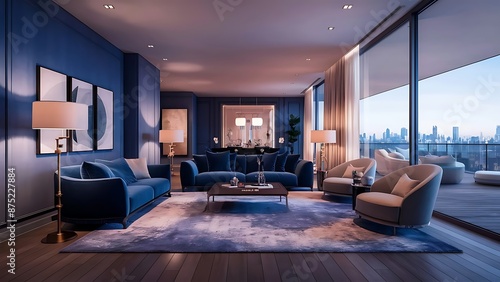© Kartik, Fototapeta premium Stylish modern interior of blue living room with luxury home accessories