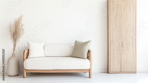 © JuanM, Naklejka premium Stylish modern living room featuring a light sofa, decorative pillows, and minimalistic furniture in a bright, airy space