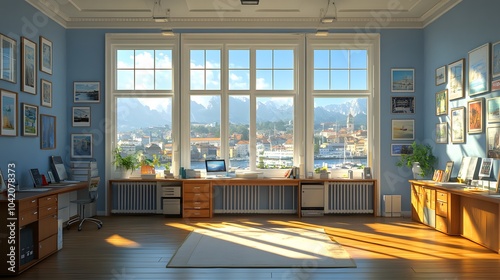 Fototapeta premium Stylish office interior with modern workstations, large glass windows, and bright lighting, 3D rendered design
