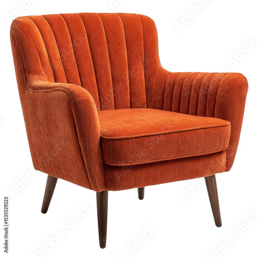 Naklejka premium stylish orange armchair with vertical stripes and wooden legs, perfect for modern interiors. This chair adds pop of color and comfort to any living space