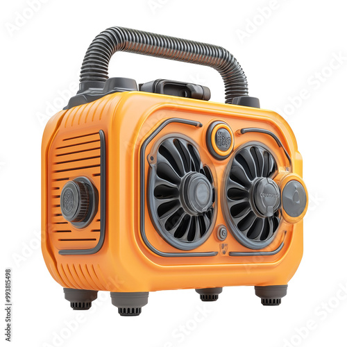 Fototapeta premium Stylish orange portable fan with two powerful dual fans, designed for outdoor relaxation and convenience. PNG. transparent background. cut out