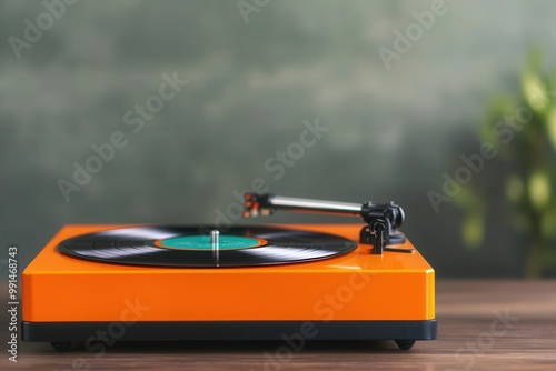 © justjupiter, Fototapeta premium Stylish orange turntable with vinyl record on wooden table, blurred green background.