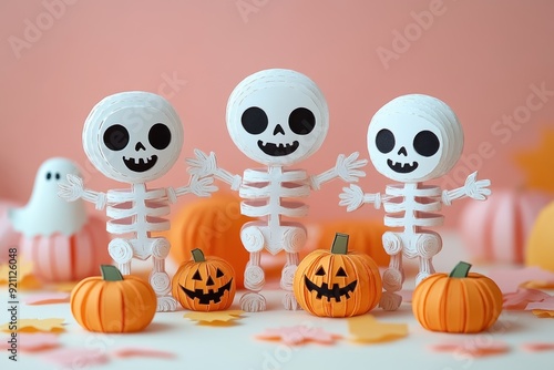 Obraz premium Stylish Paper Art Dancing Skeleton with Pumpkin and Ghost
