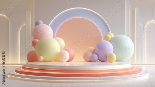 © Firadoaw, Fototapeta premium Stylish product podium with pastel geometric balloons and minimalistic decoration, abstract background for creative presentations