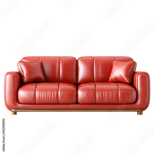 © Jiranath, Fototapeta premium Stylish Red Leather Sofa with Plush Cushions for Modern Living Room Decor and Comfort
