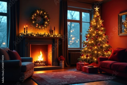 Fototapeta premium Stylish room, decorated fireplace, glowing Christmas tree, decoration,...