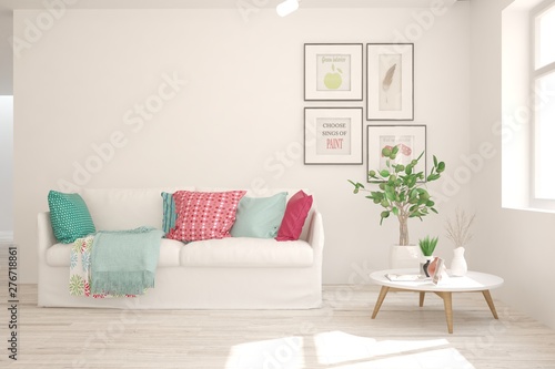 Fototapeta premium Stylish room in white color with sofa. Scandinavian interior design. 3D...