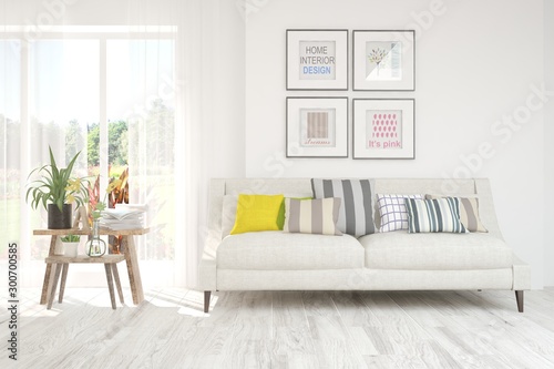© AntonSh, Fototapeta premium Stylish room in white color with sofa. Scandinavian interior design. 3D illustration