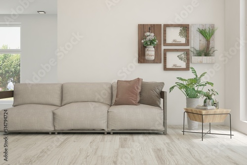 Fototapeta premium Stylish room in white color with sofa. Scandinavian interior design. 3D illustration