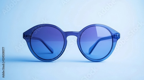 Fototapeta premium Stylish round sunglasses with blue lenses placed against a light background emphasizing their modern design and color
