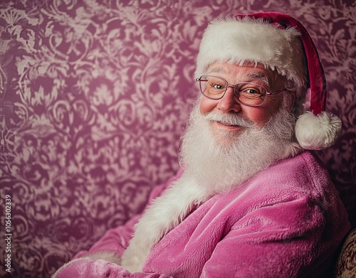 Obraz premium stylish Santa Claus dressed in a purple suit, surrounded by purple gift boxes, with snowflakes falling gently around him. The scene combines traditional holiday cheer with a modern, trendy color