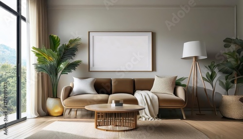 Fototapeta premium Stylish Scandinavian Living Room with Framed Poster Mockup, Invoking Warmth...