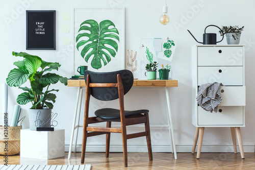 © FollowTheFlow, Obraz premium Stylish scandinavian open space with office desk with mock up poster frames, a lot of plants and office accessories. Brown wooden parquet and white backgrounds wall. Floral concept of interior decor.
