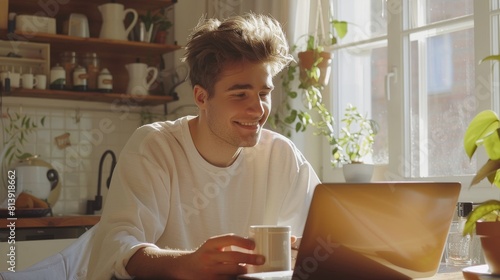 © Антон Сальников, Naklejka premium Stylish Scandinavian style portrait of a smiling young man working on a laptop at home and drinking coffee from the mug.