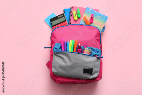 Obraz premium Stylish school backpack with different stationery supplies on pink background