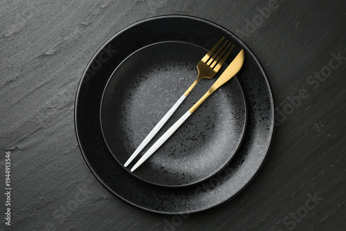 © New Africa, Fototapeta premium Stylish setting with cutlery on black table, top view
