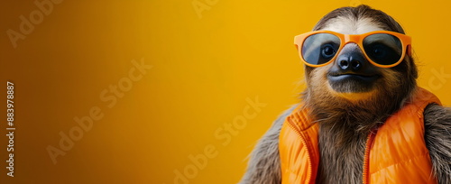 © Vasiliy, Obraz premium Stylish sloth in sunglasses and an orange vest on a yellow background with copy space