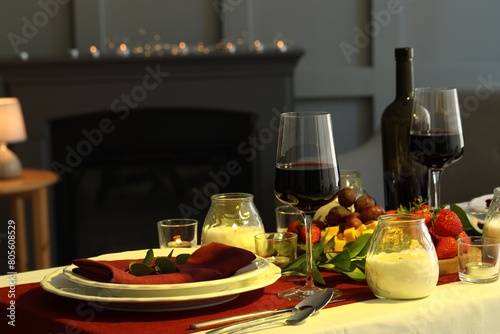 Naklejka premium Stylish table setting with burning candles and wine indoors. Romantic dinner
