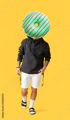 Fototapeta premium Stylish tattooed man with tasty doughnut instead of his head on yellow...
