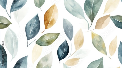 Obraz premium Stylish watercolor leaf pattern in shades of green, blue, light brown, and gray, seamlessly blending on a white background