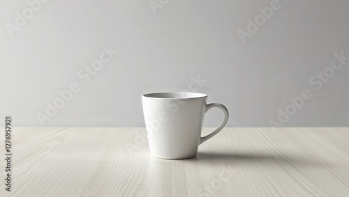 © Den Boro Day, Obraz premium Stylish White Coffee Cup Mockup on a Smooth Wood Table