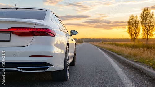 Fototapeta premium Stylish white luxury car parked on an empty road with a stunning sunset...