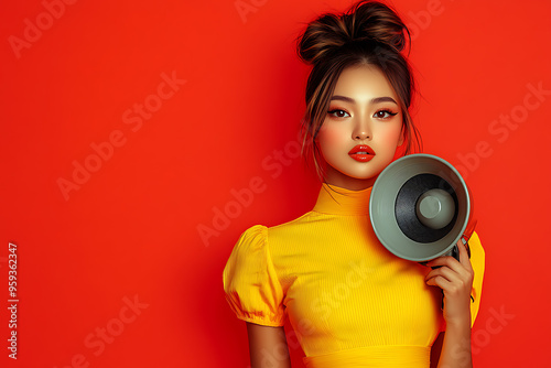 © Evhen Pylypchuk, Obraz premium Stylish woman in a red outfit holding a loudspeaker against a bright yellow background, with ample space for text on the side.