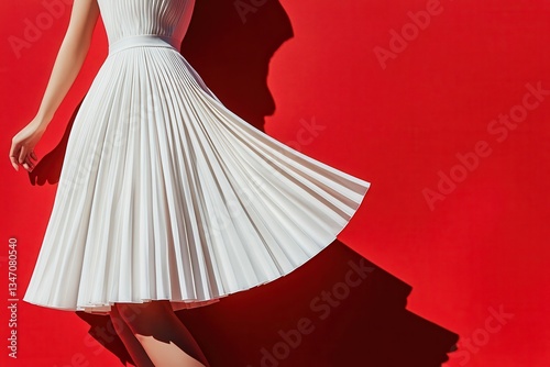 © Nyxoria, Obraz premium Stylish woman in a white pleated dress poses against a vibrant red background showcasing fashion and elegance during the day