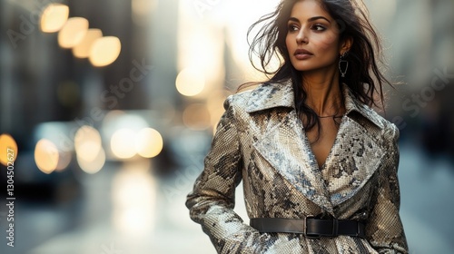 © Larisa, Fototapeta premium Stylish woman in animal print coat walks confidently through cit