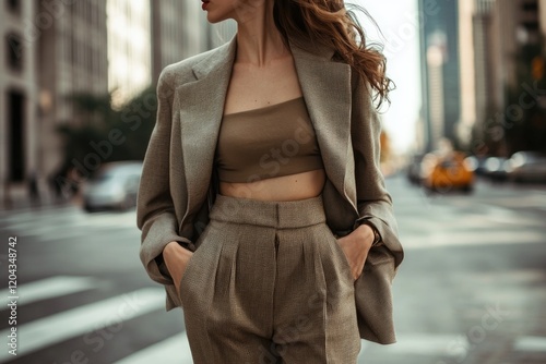 © Viktoriia, Fototapeta premium Stylish woman in chic outfit walks confidently through urban str
